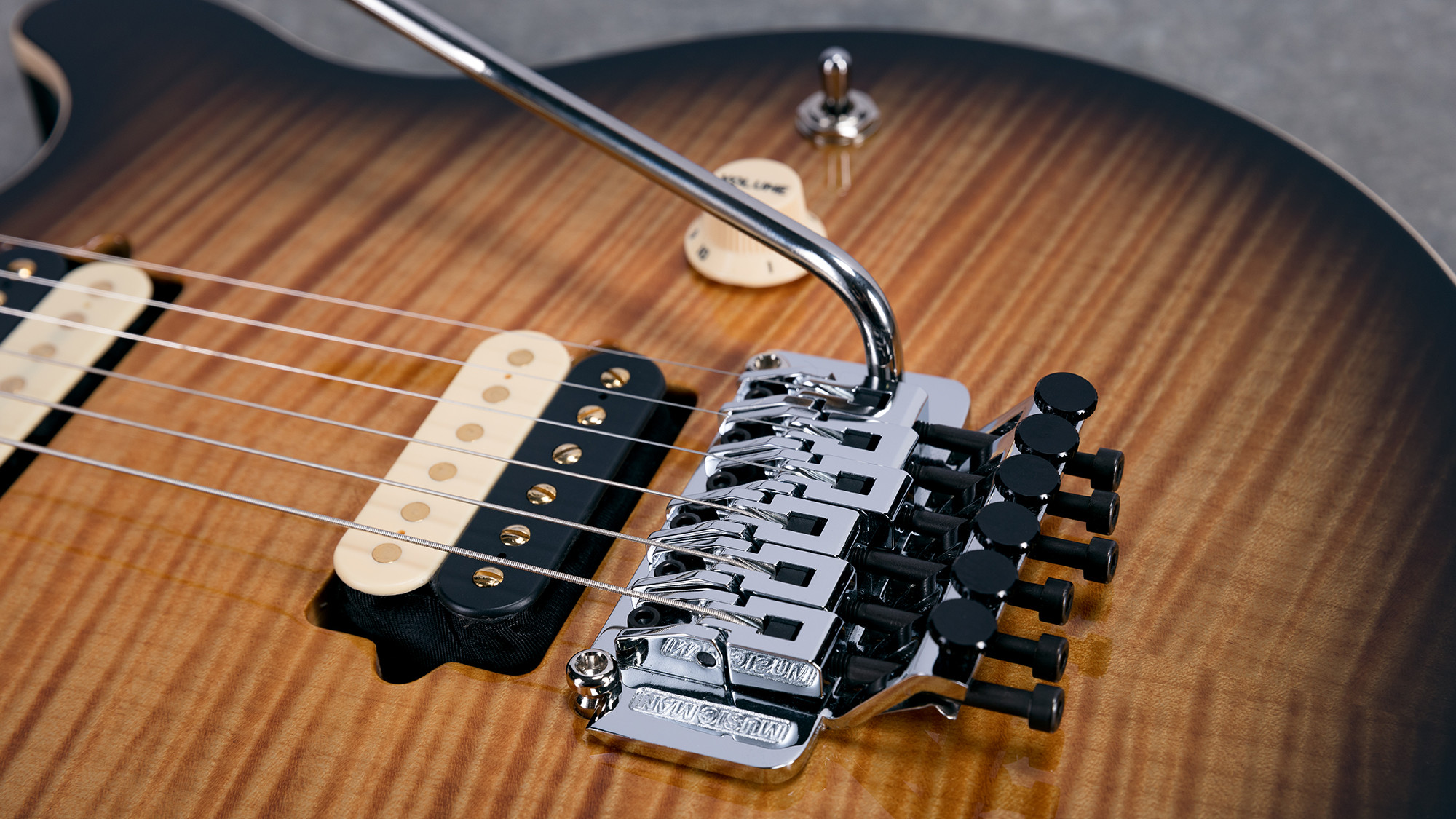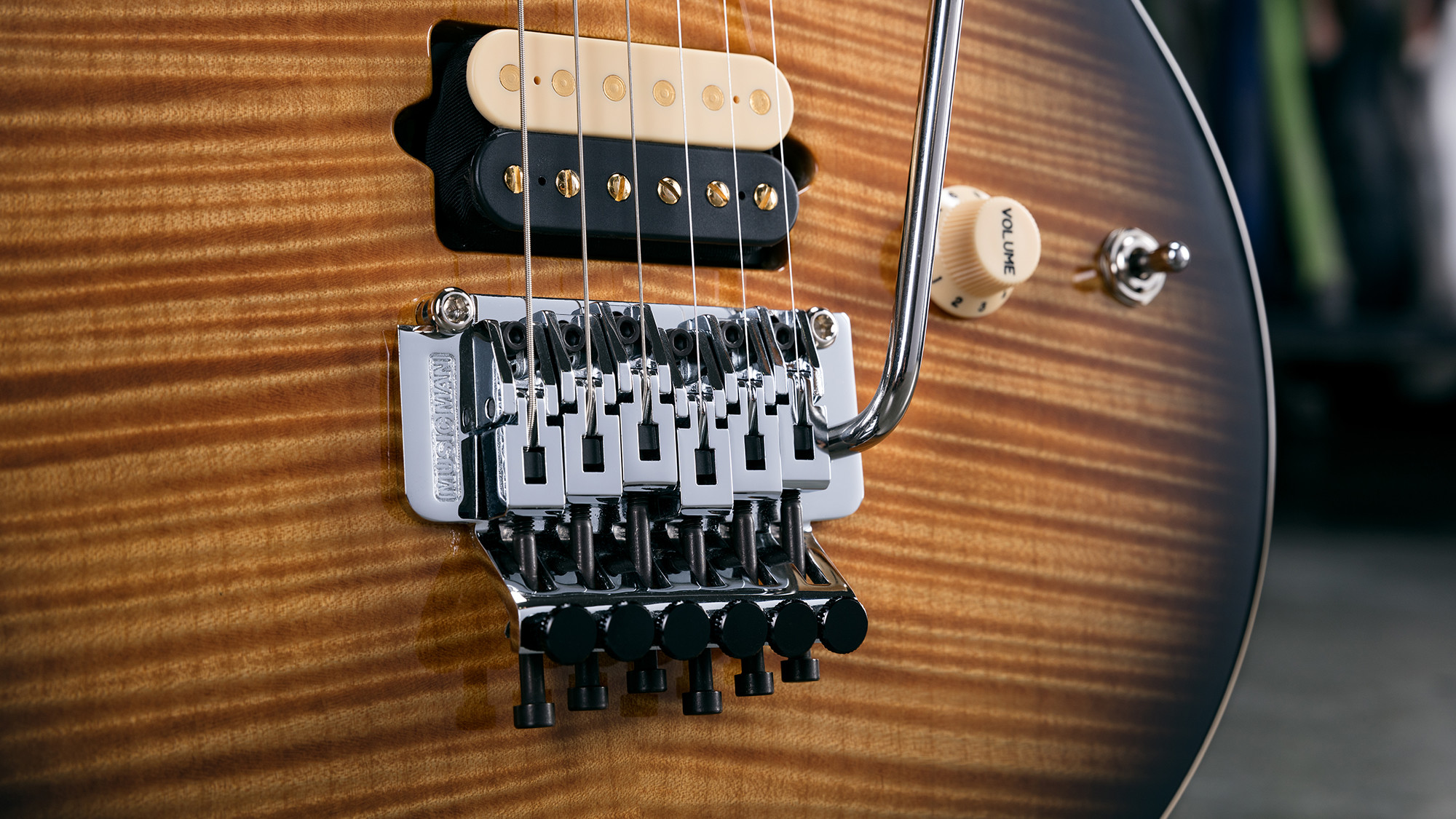 The figured maple neck is accented by a matching painted headstock and Schaller locking tuners.