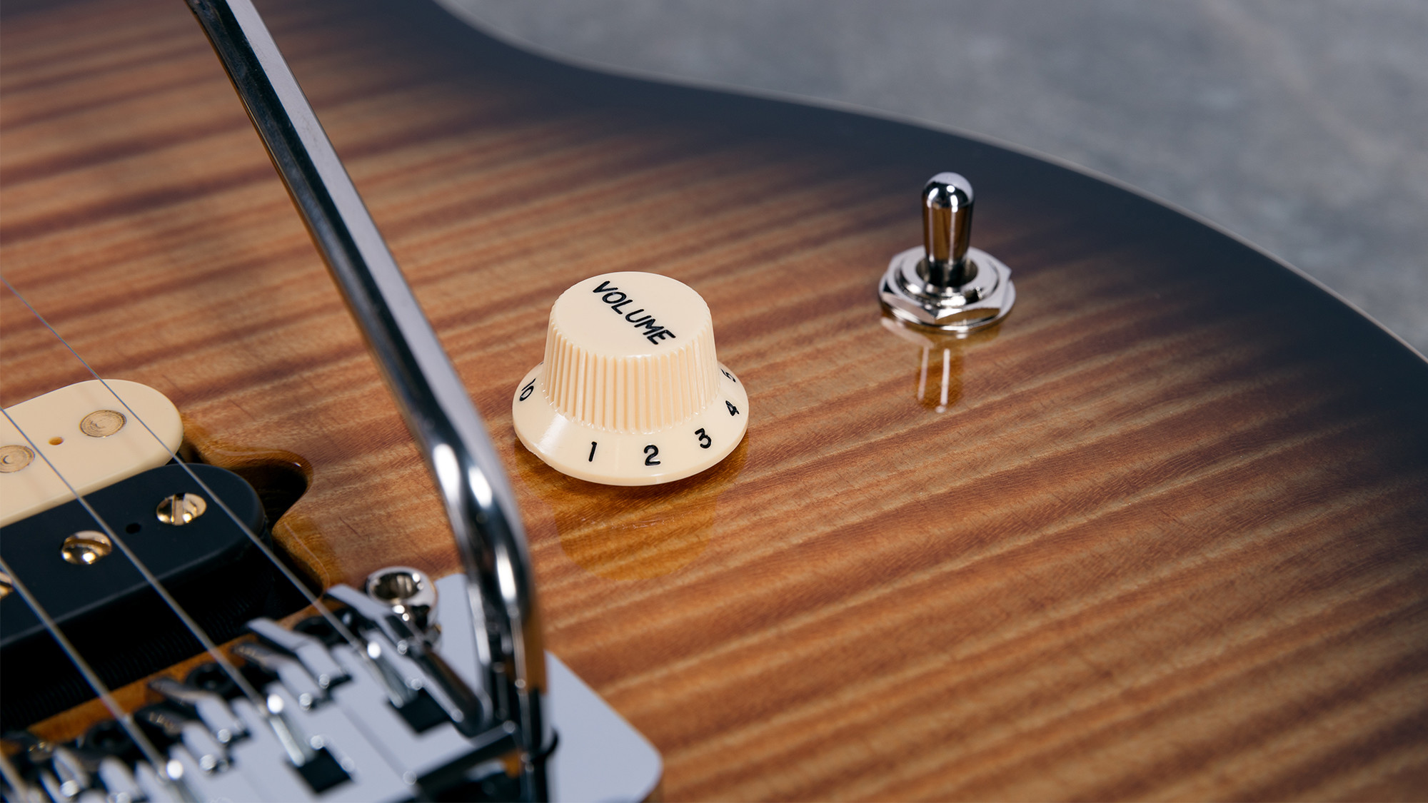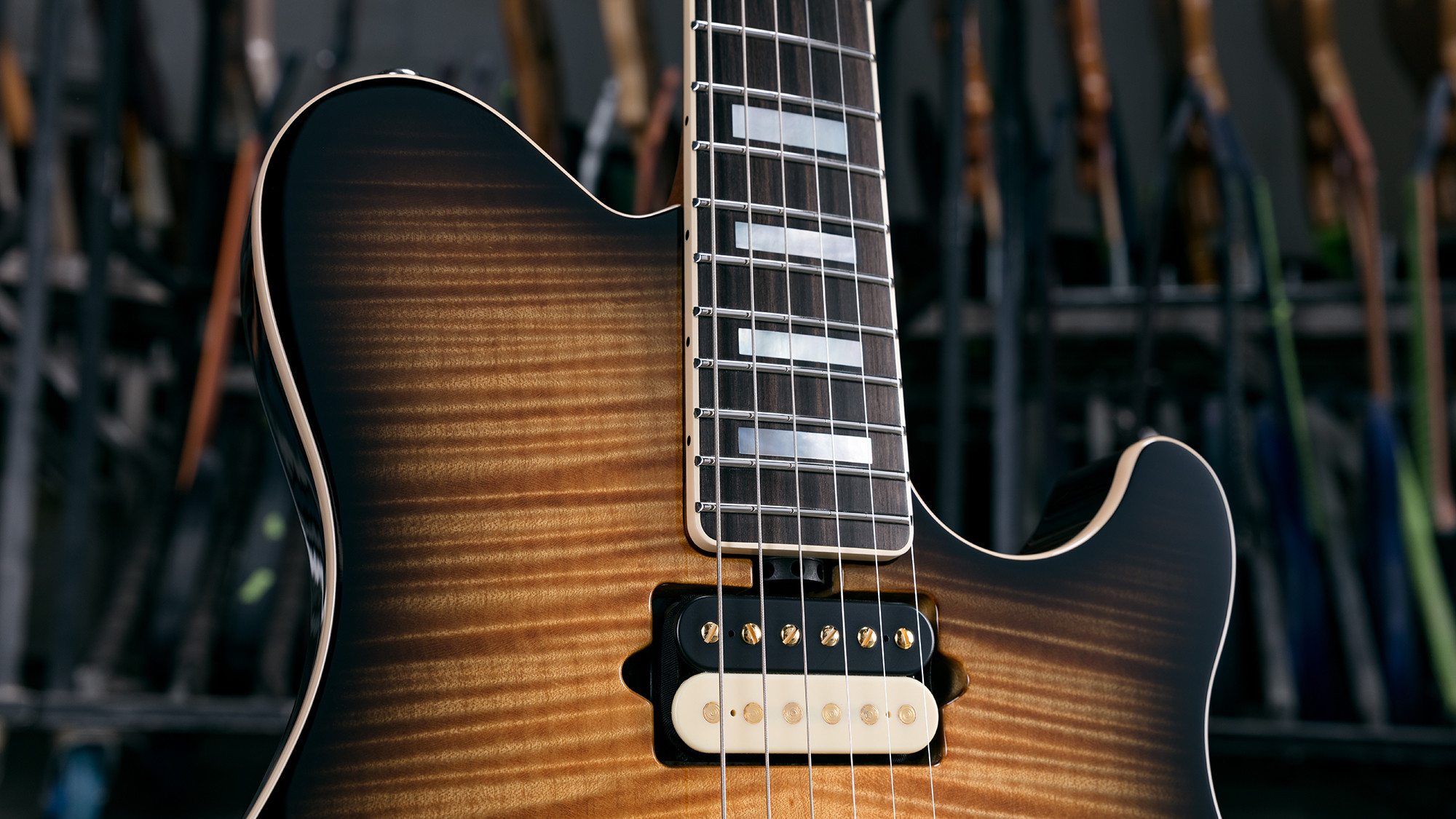 Flame figured maple top in a hand-stained custom Butterscotch finish is accented with gold pole pieces on the humbuckers.