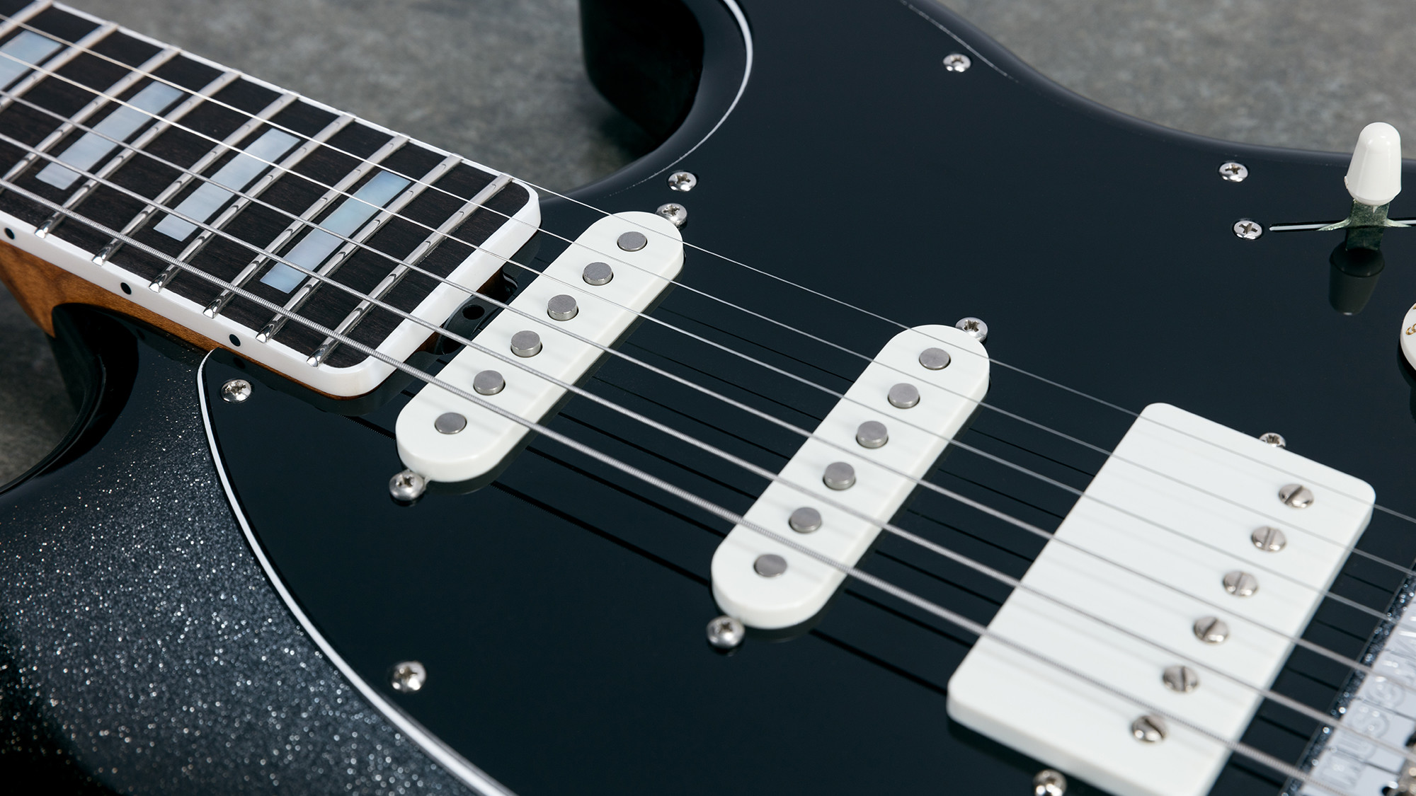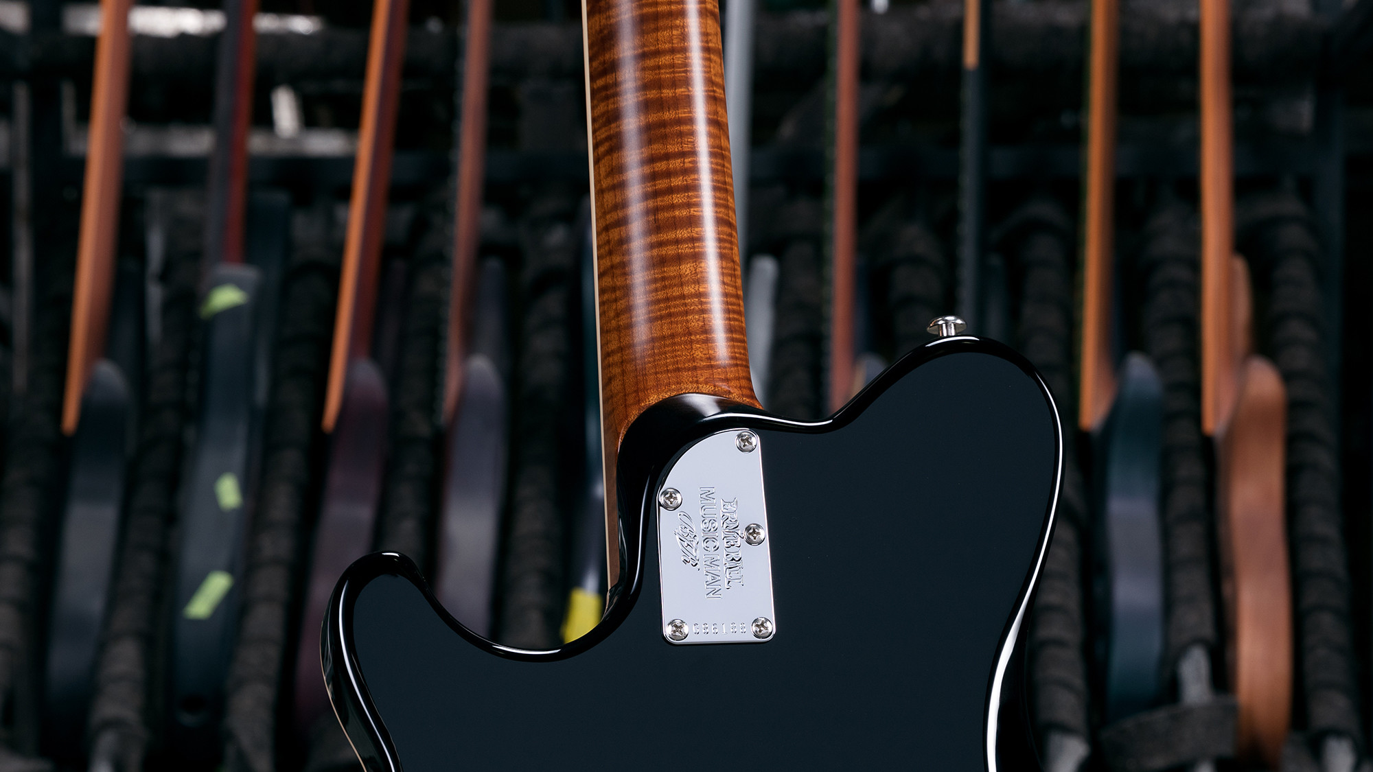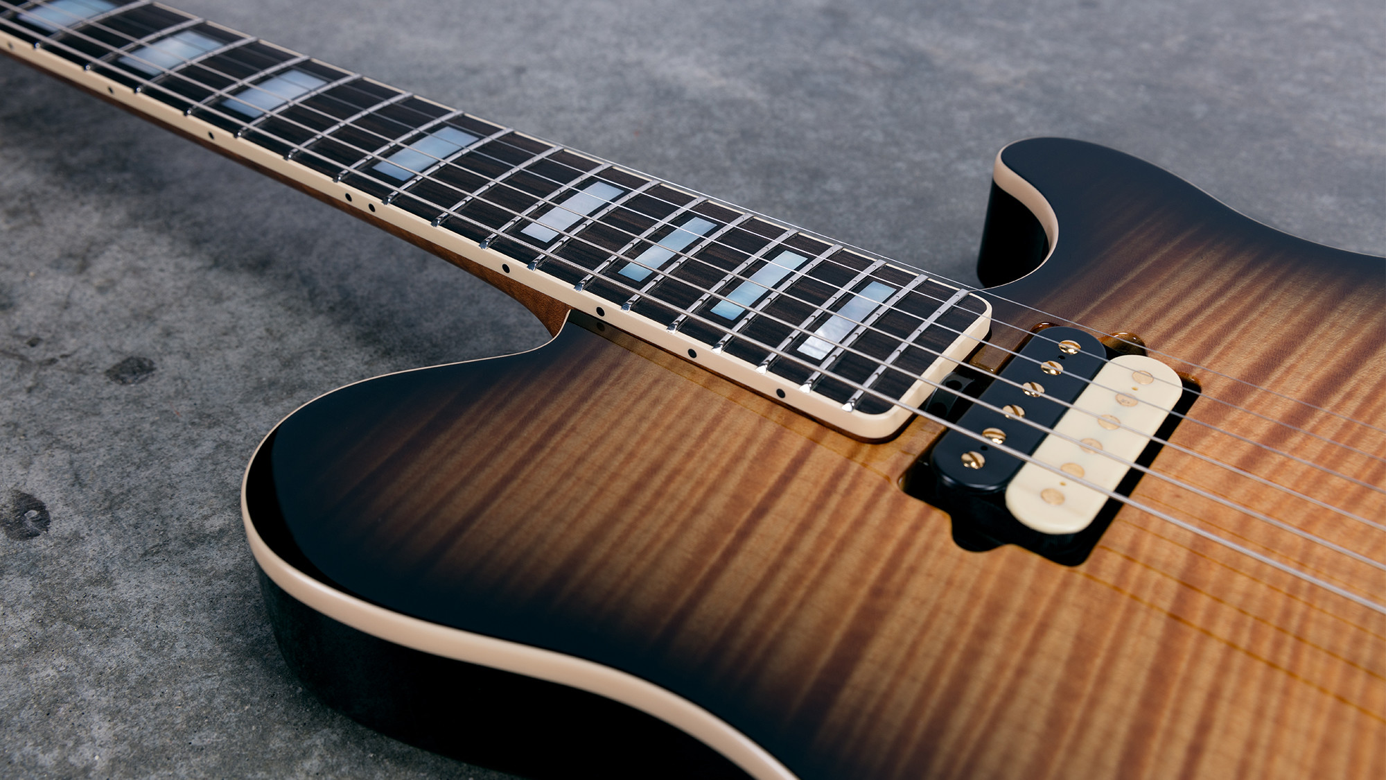 The 24 fret ebony fingerboard does not feature fret markers for a streamlined unique appearance.