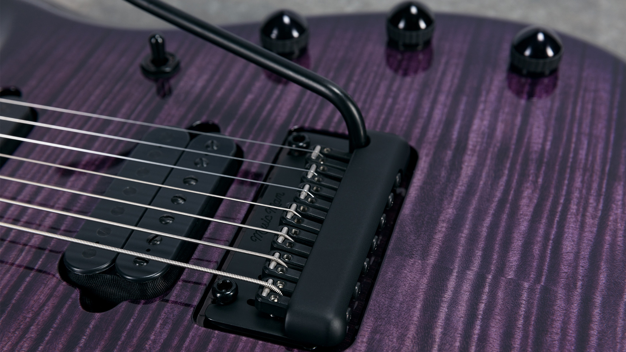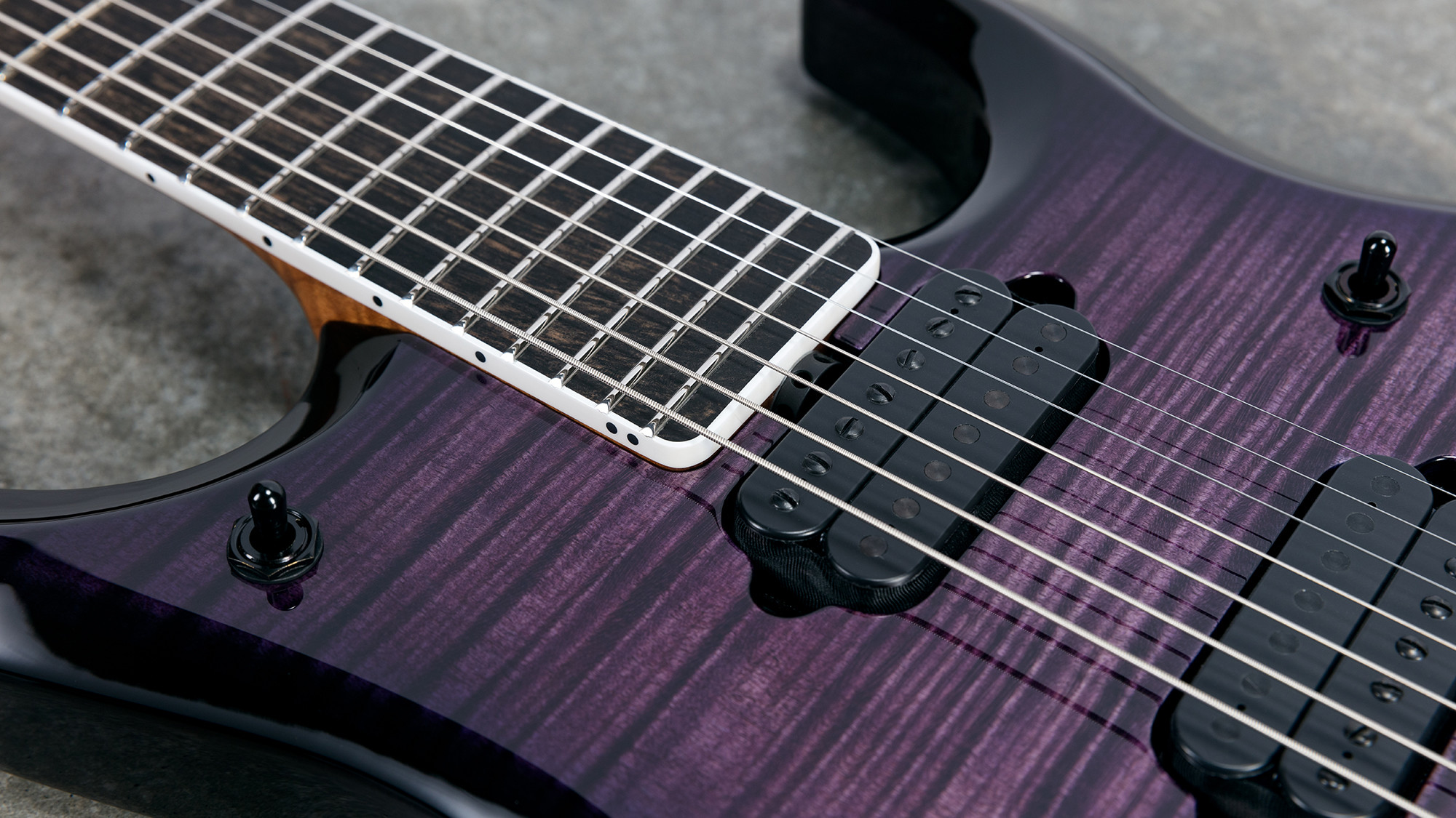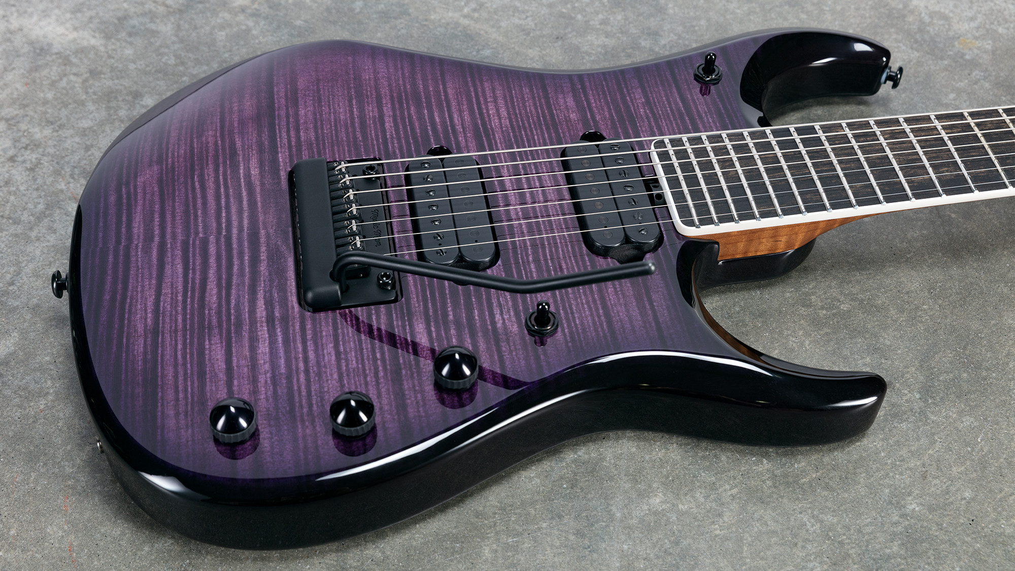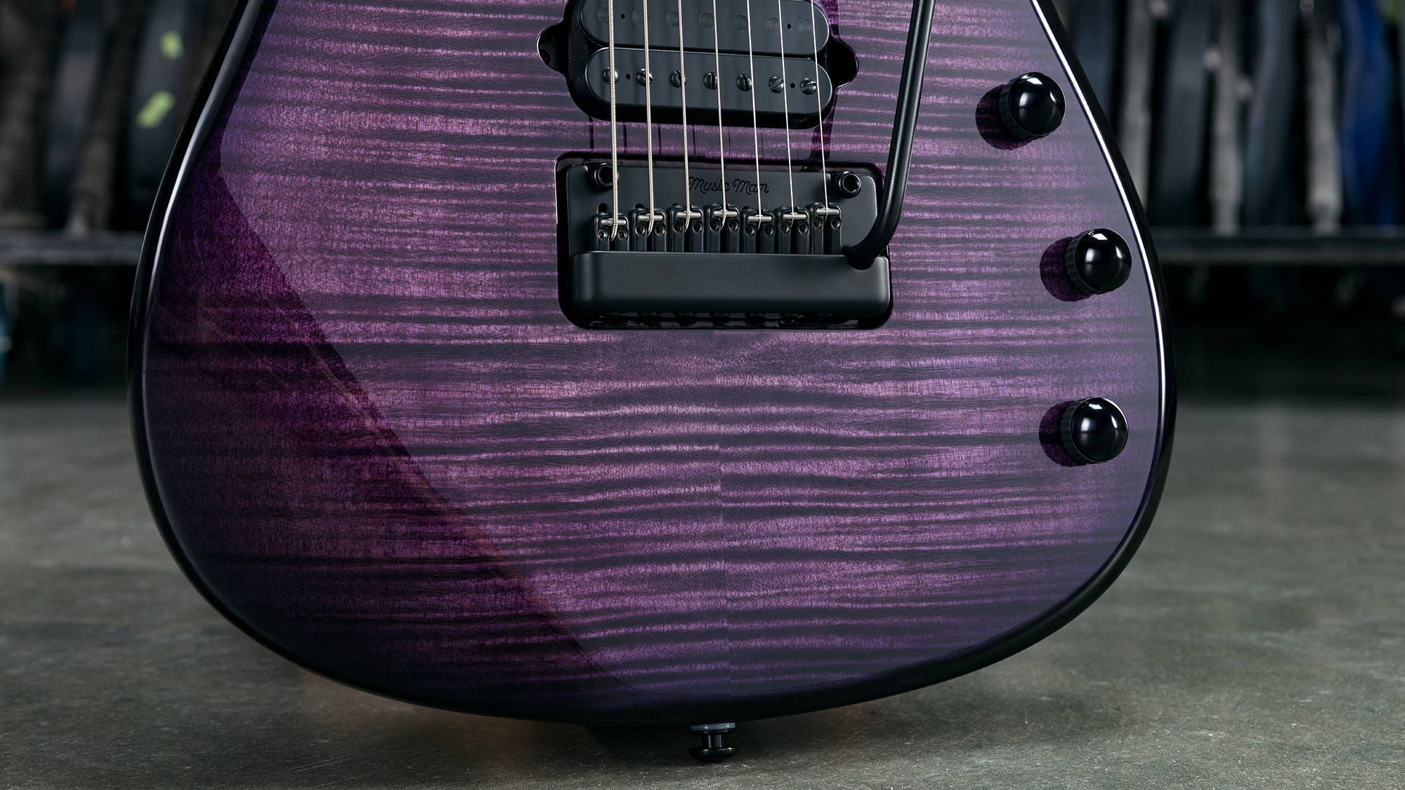 Flame figured maple top in a hand-stained custom Eminence Purple Burst finish, with translucent black finish on the back.