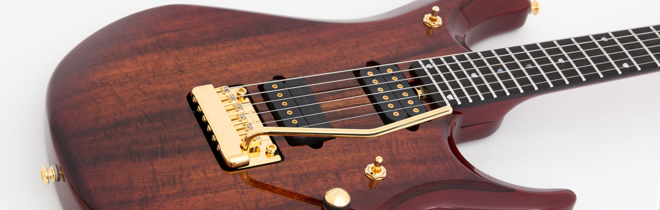 Bridge | Custom John Petrucci Music Man® Piezo floating tremolo of chrome plated, hardened steel with solid steel saddles; Optional Koa top comes with gold hardware | |