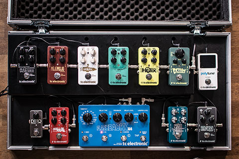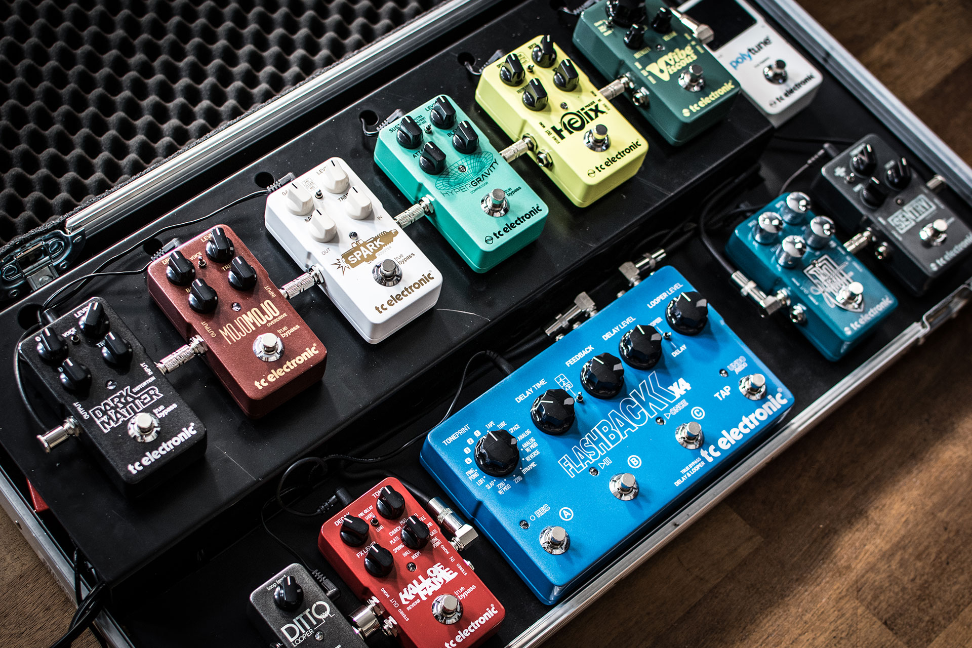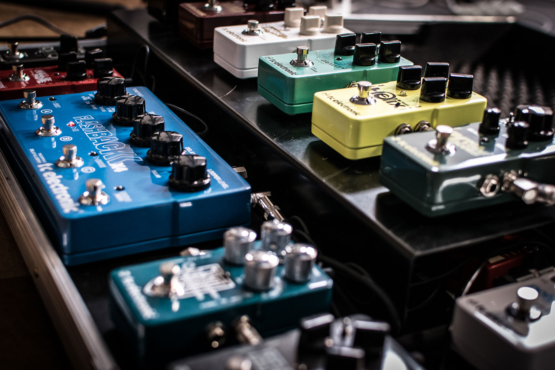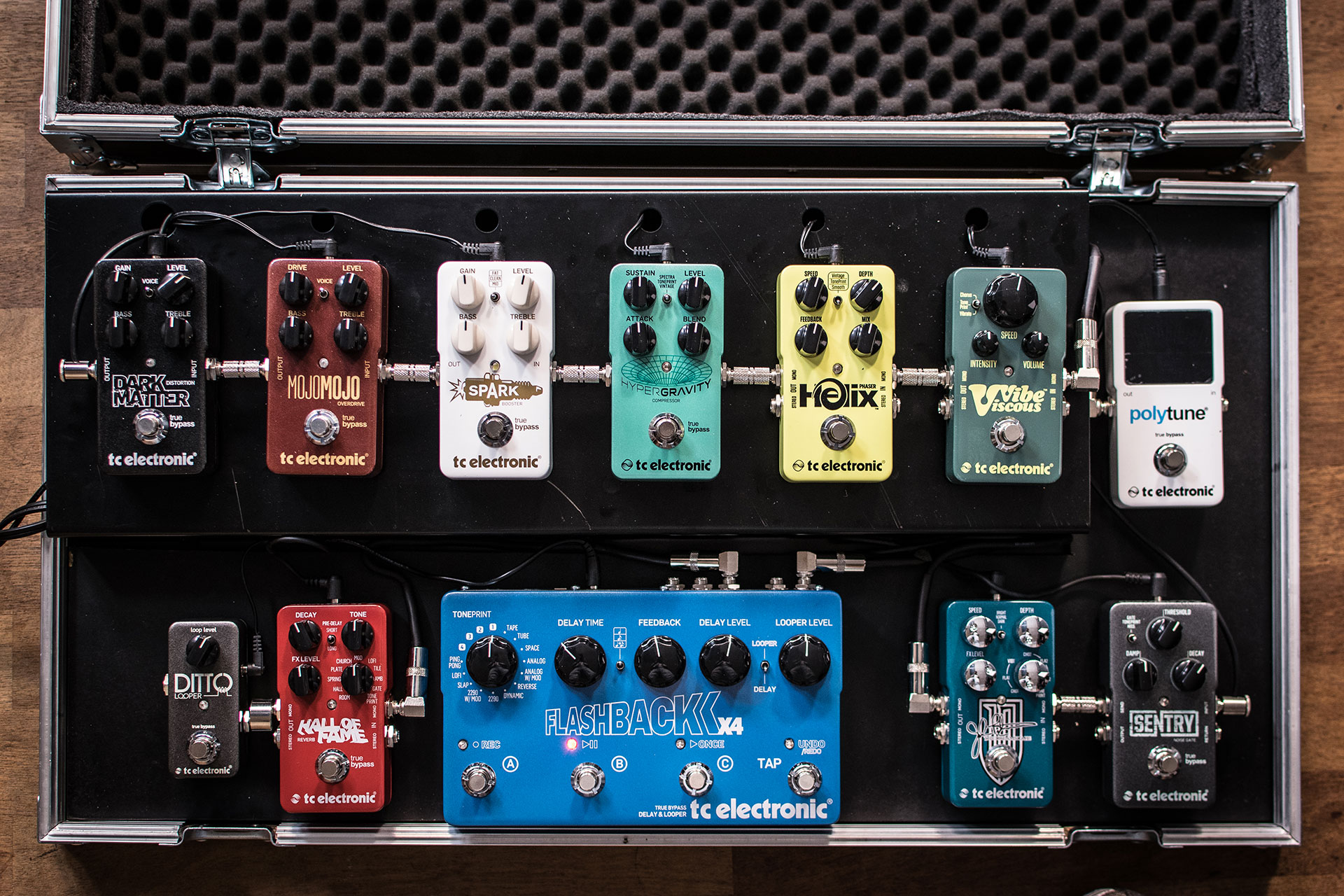An Ernie Ball Music Man Majesty 6 Electric Guitar, a TC Electronic Pedal Board including: MojoMojo Overdrive, Spark Booster, Flashback x4 Delay, Viscous Vibe, Helix Phaser, Dark Matter Distortion, HyperGravity Compressor, Sentry Noise Gate, Ditto Looper, Dreamscape, Hall of Fame Reverb, PolyTune 2.